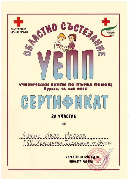 – във випуск 12. клас – 1-во място: Йордан Тодоров Проданов – ГРЕ „Г. С. Раковски“ – Бургас, 2-ро място: Божана Емилова Колева – ЕГ „Пловдив“ – Пловдив, 3-то място: Мариета Йорданова Григорова – ЕГ „Проф. Асен Златаров“ – Велико Търново.