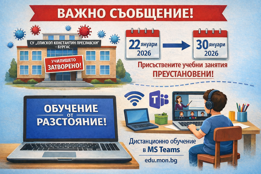1. Поради въведени със заповед № 01-12/20.1.2026 г. на Директора на РЗИ – Бургас на територията на област Бургас временни противоепидемични мерки срещу разпространението на грип и на остри респираторни заболявания да бъдат преустановени учебните занятия в присъствена форма на обучение – дневна, комбинирана и индивидуална, както и всички групови и извънкласни дейности и дейности по интереси за учениците от Средно училище „Епископ Константин Преславски“ – Бургас в дните от 22.1.2026 г. (четвъртък) до 30.1.2026 г. (петък) включително.