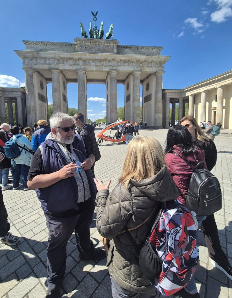 На 21 април Берлин реши да ни покаже и чувството си за хумор. И то чрез човек, който трудно може да бъде забравен – нашият гид Щефан Хайтбринк. Българският му беше с лек немски акцент, но шегите – напълно универсални. Още в началото ни хвърли направо в Студената война с едно изречение, което звучеше почти като загадка: „Западен Берлин в епохата на Студената война е бил единственият остров в света, при който накъдето и да погледнеш от всички посоки изгрява слънцето, защото навсякъде е изток.“ И докато се опитвахме да го осмислим, вече се смеехме на следващото: „В Mall of Berlin на 44 000 кв.м. може да получите всичко от което нямате нужда.“ История, ирония и реалност – всичко в едно.