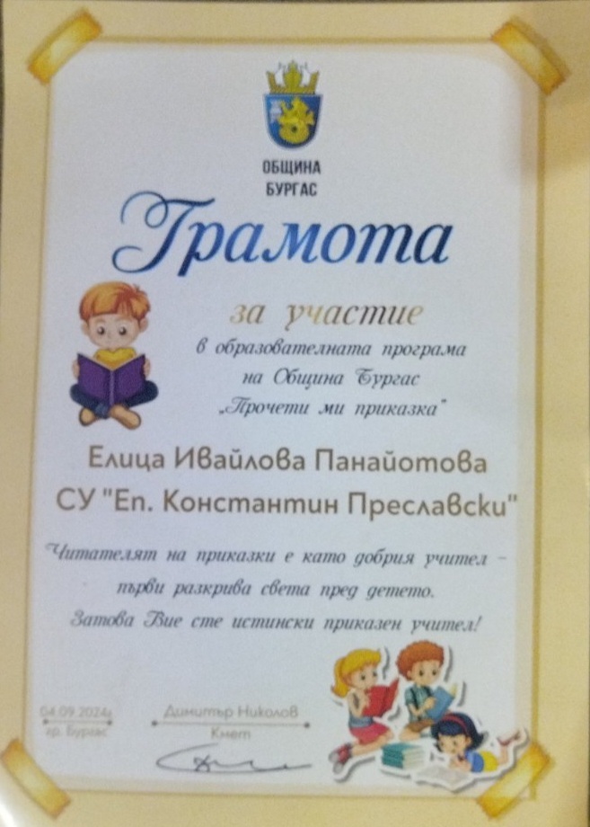 Победител в училищния онлайн конкурс „Разказ за сърцето“ в Средно училище „Епископ Константин Преславски“ – Бургас е разказът на Иван Калфов от X „а“ клас – „Прозрение“. В дистанционната проява, посветена на противодействието на тормоза и агресията в училище