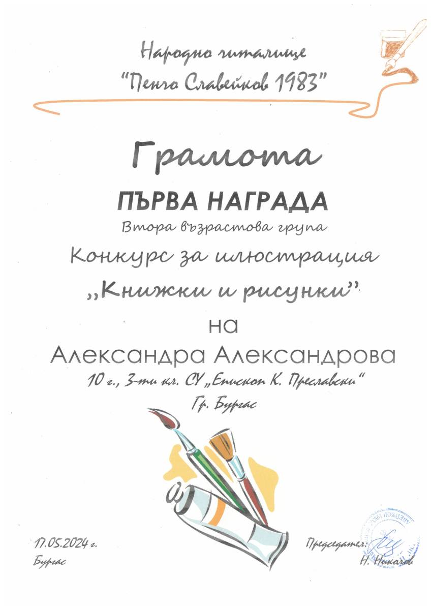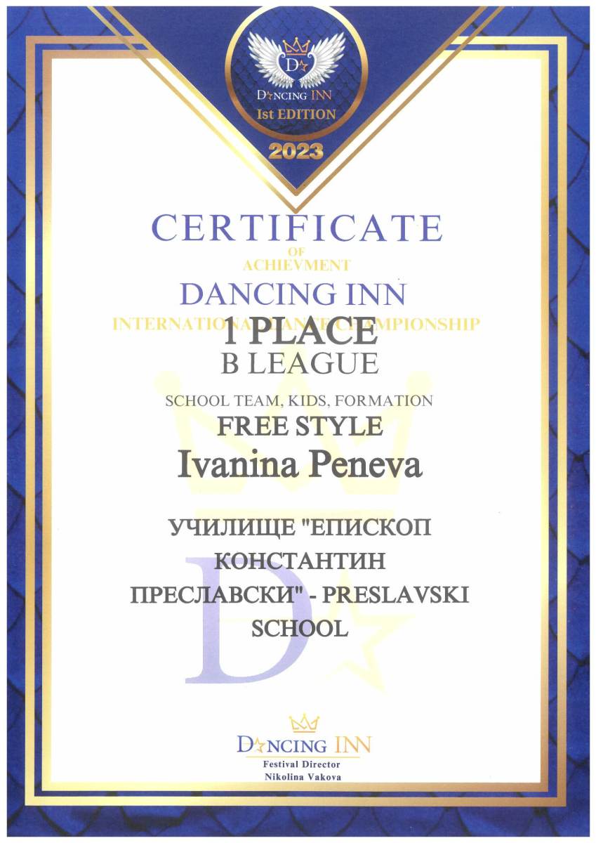 Делът на дипломираните от 48-те абитуриенти на „Преславски“ за тази година е 100%!      С най-висок резултат от матурите е Даниел Илиев от XII а клас – по английски език с Отличен (5,99), като отличните оценки за нашите ученици