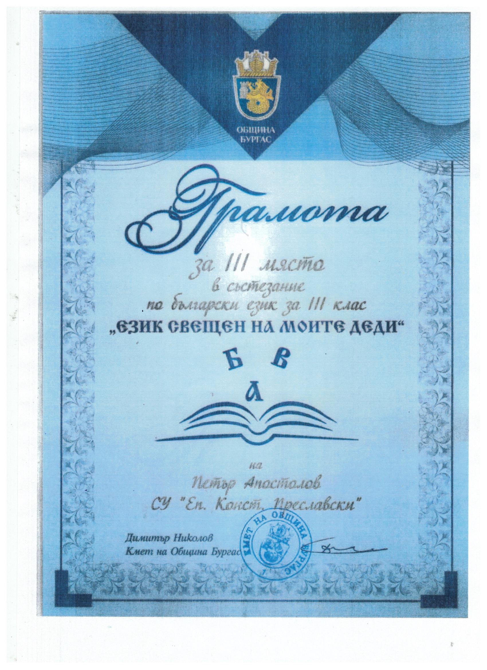 Уважаеми родители на четвъртокласници,   Уведомяваме Ви, че за учебната 2023/2024 година Средно училище „Епископ Константин Преславски“ – Бургас обявява 41 свободни места за ученици, завършващи IV клас в други училища, както следва. V А клас (иновативна паралелка, ФУЧ: Български