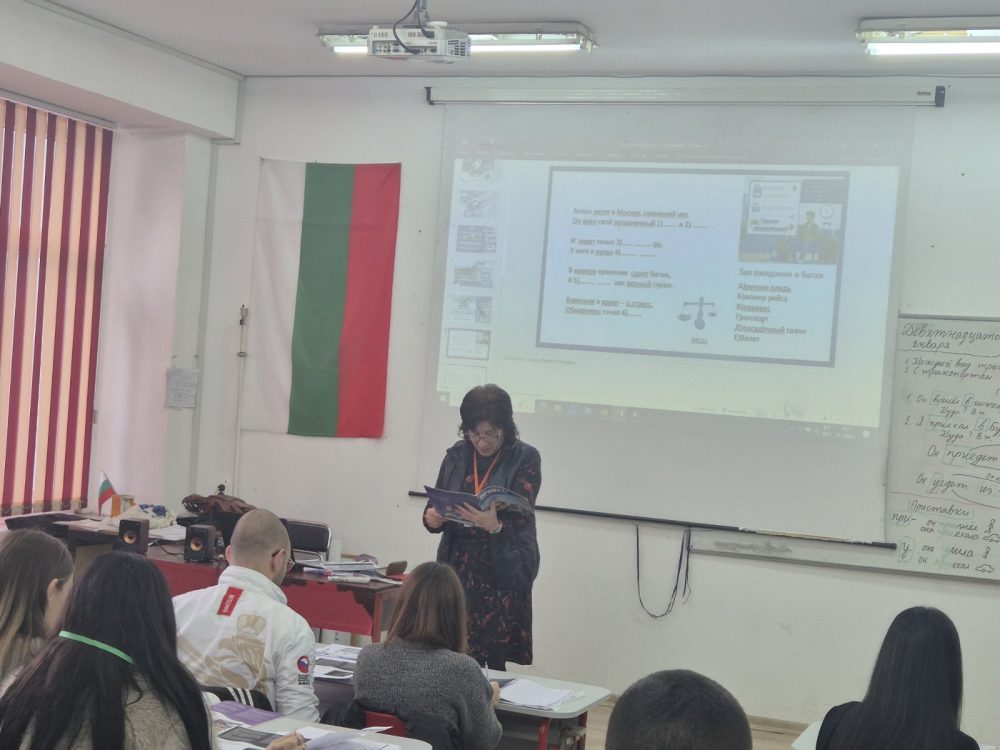 Езиковите задачи бяха умело вплетени в темата. Учениците решаваха интересни упражнения с глаголи за движение с представки, като едновременно с това упражняваха родителен и винителен падеж в руския език. Комбинацията от съдържание, визуализация и активно участие показа как сложната граматика може да бъде преподавана по достъпен и мотивиращ начин.