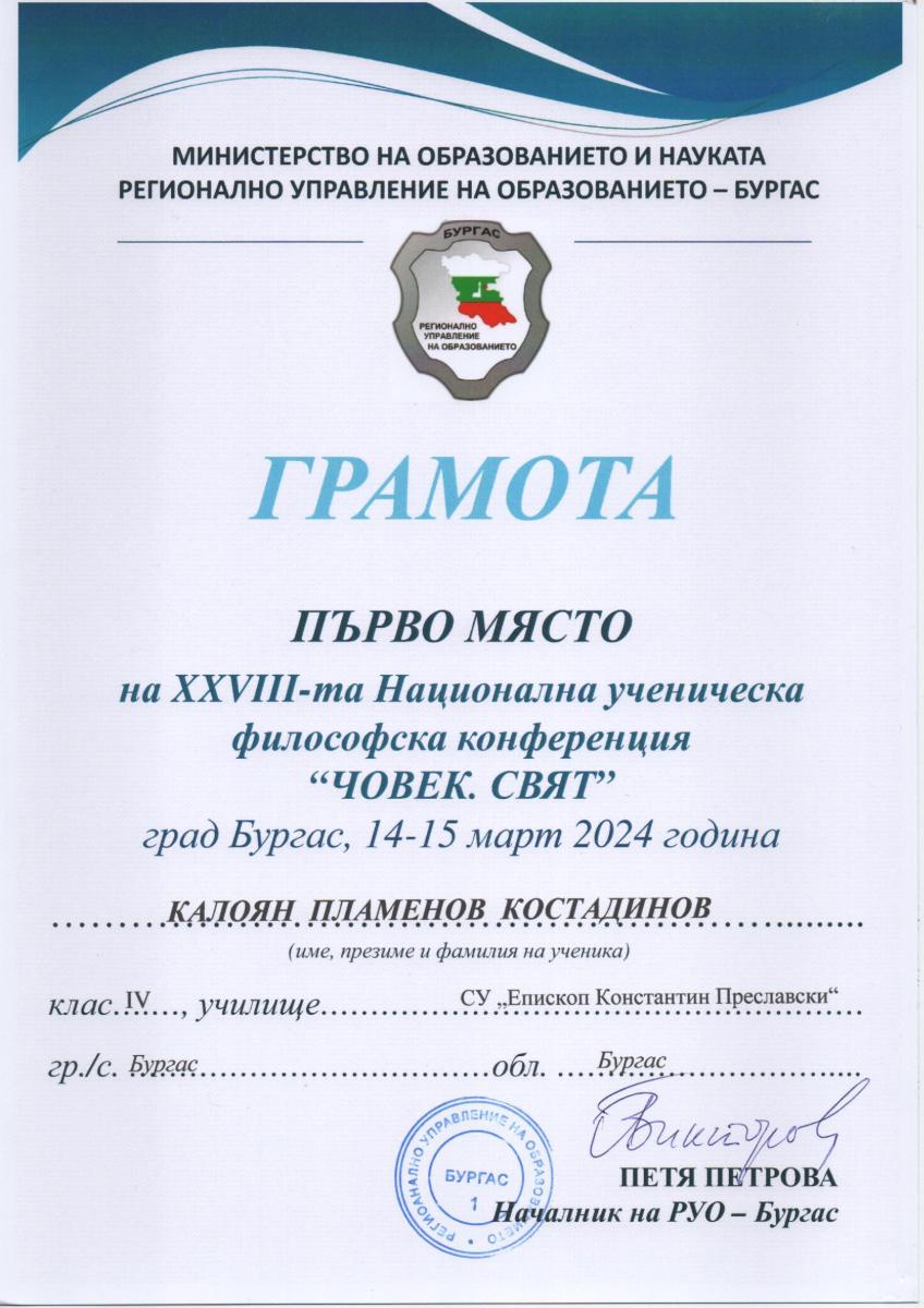В периода 8-10 март 2024 г., младите предприемачи от Средно училище „Епископ Константин Преславски“, взеха участие в първия етап от състезанието „Зелено бъдеще – Храна“, организирано от Джуниър Ачийвмънт България и Европейския институт за иновации и технологии с още 14 екипа от цялата страна – Foodathon – иновационен лагер,