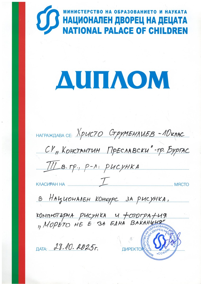 След проверката на творбите от компетентното жури в София 11 (единадесет) наши ученици получиха максималния сбор от 50 точки. Това са Ивайла Урумова, Вероника Славчева, Антоанета Георгиева от 1б клас, Красимира Димитрова от 1в клас, Силвия Кънчева, Ралица Желева, Лиана Петрова от 2б клас, Вероника Баева, Мишел Димитрова от 3а клас, Виктория Антонова и Кристияна Георгиева от 3б клас.