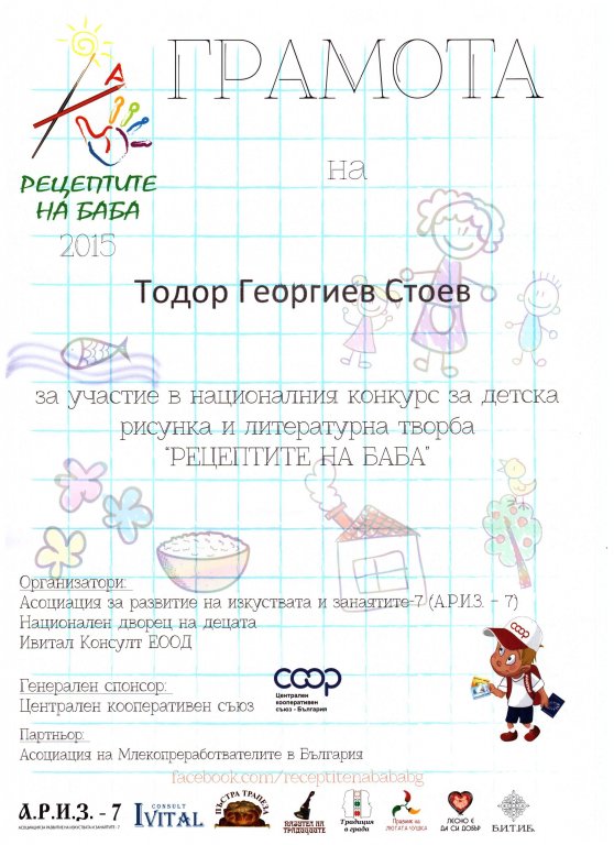 Алекс Мирославов Стефанов от Іа клас завоюва ІІ място с 98 точки от 100 на състезанието “Simon asks”, което се проведе на 26.04.2014 г. в Основно училище „Антон Страшимиров“. В оспорваната надпревара със своите връстници от другите бургаски училища,