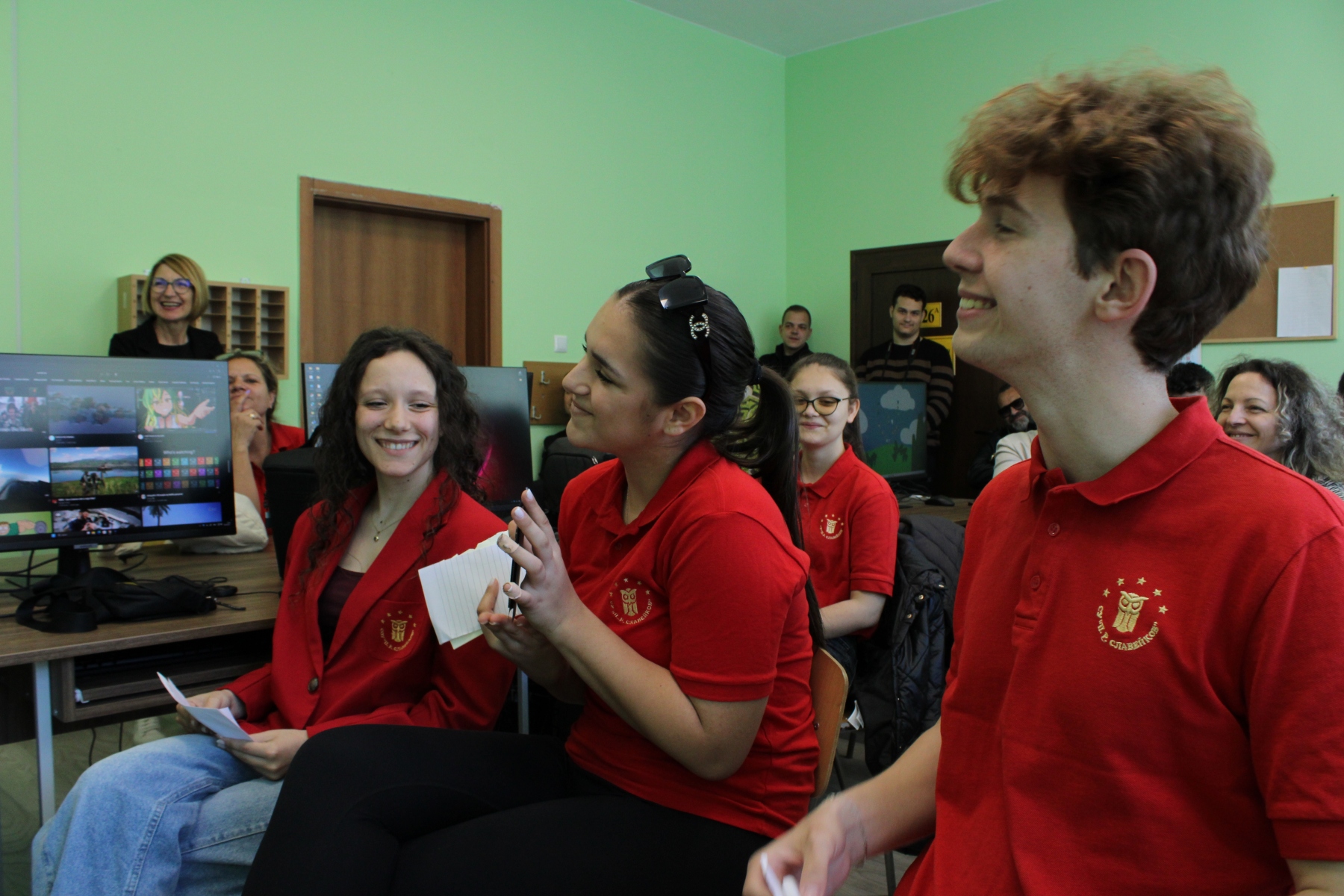 🔹 В гимназиален етап се проведе впечатляващ открит урок на тема „Вокално-визуален AI“ по програма на Училищна Телерик Академия. Ученици от ХВ клас демонстрираха творчески проект с интеграция на изкуствен интелект, визуални и звукови елементи.