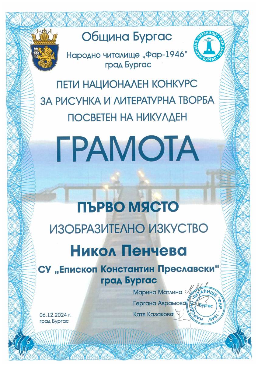Магдалина Стоянова се отличи сред над 500 участника от цялата страна с вдъхновяващата си творба, създадена в клуба по изящни изкуства към нашето училище, под ръководството на г-н Данаил Николов. Журито, съставено от осем изтъкнати експерти в областта на изкуството, високо оцени нейната креативност и оригинален подход.